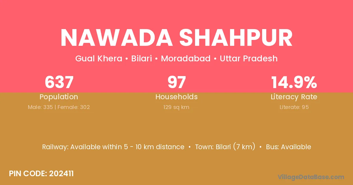 Bilari (7 km) is the nearest town to Nawada Shahpur village for major economic activities and is located approximately 7 km away.