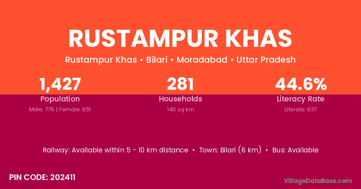 Bilari (6 km) is the nearest town to Rustampur Khas village for major economic activities and is located approximately 6 km away.