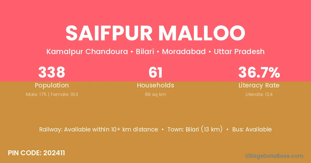 Bilari (13 km) is the nearest town to Saifpur Malloo village for major economic activities and is located approximately 13 km away.