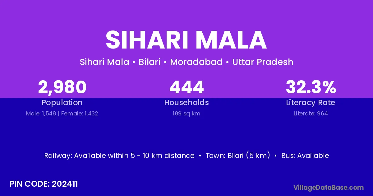 Bilari (5 km) is the nearest town to Sihari Mala village for major economic activities and is located approximately 5 km away.