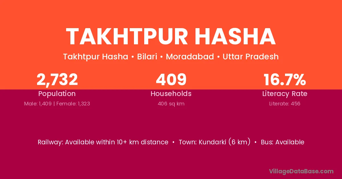 Kundarki (6 km) is the nearest town to Takhtpur Hasha village for major economic activities and is located approximately 6 km away.