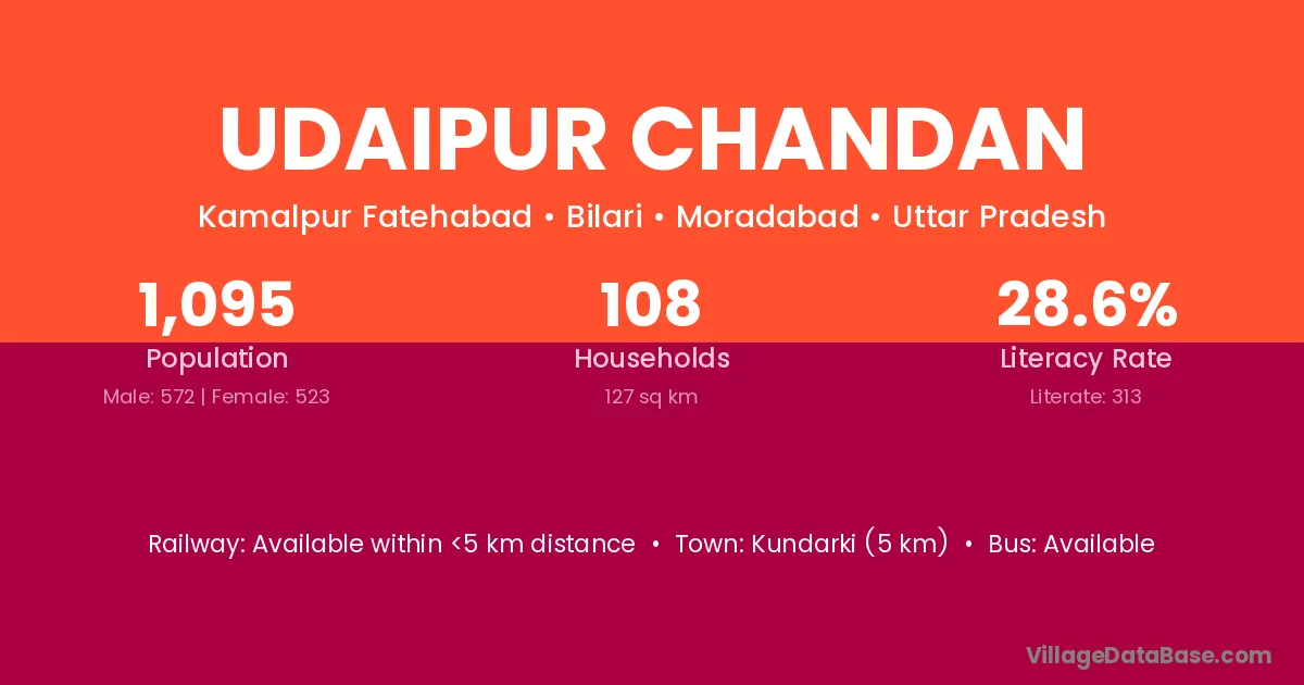 Kundarki (5 km) is the nearest town to Udaipur Chandan village for major economic activities and is located approximately 5 km away.
