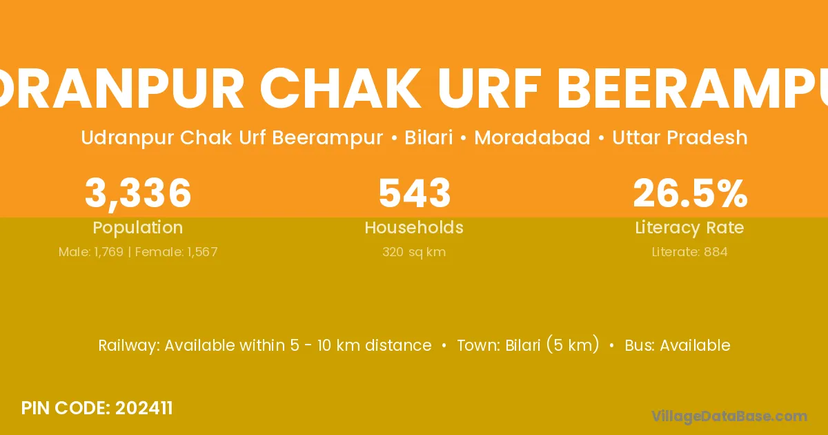 Bilari (5 km) is the nearest town to Udranpur Chak Urf Beerampur village for major economic activities and is located approximately 5 km away.