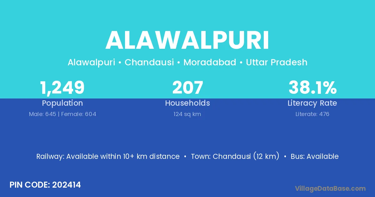 Chandausi (12 km) is the nearest town to Alawalpuri village for major economic activities and is located approximately 12 km away.