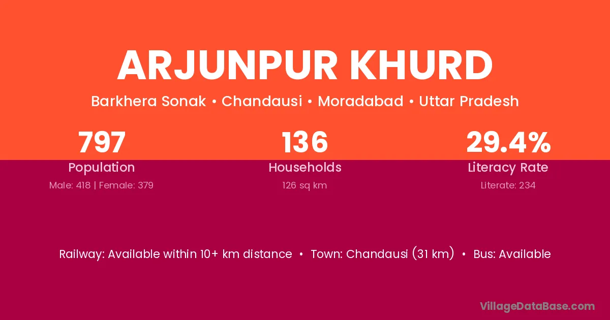 Chandausi (31 km) is the nearest town to Arjunpur Khurd village for major economic activities and is located approximately 31 km away.