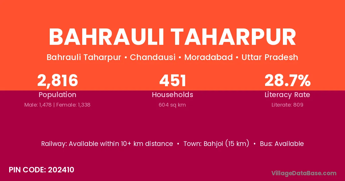Bahjoi (15 km) is the nearest town to Bahrauli Taharpur village for major economic activities and is located approximately 15 km away.