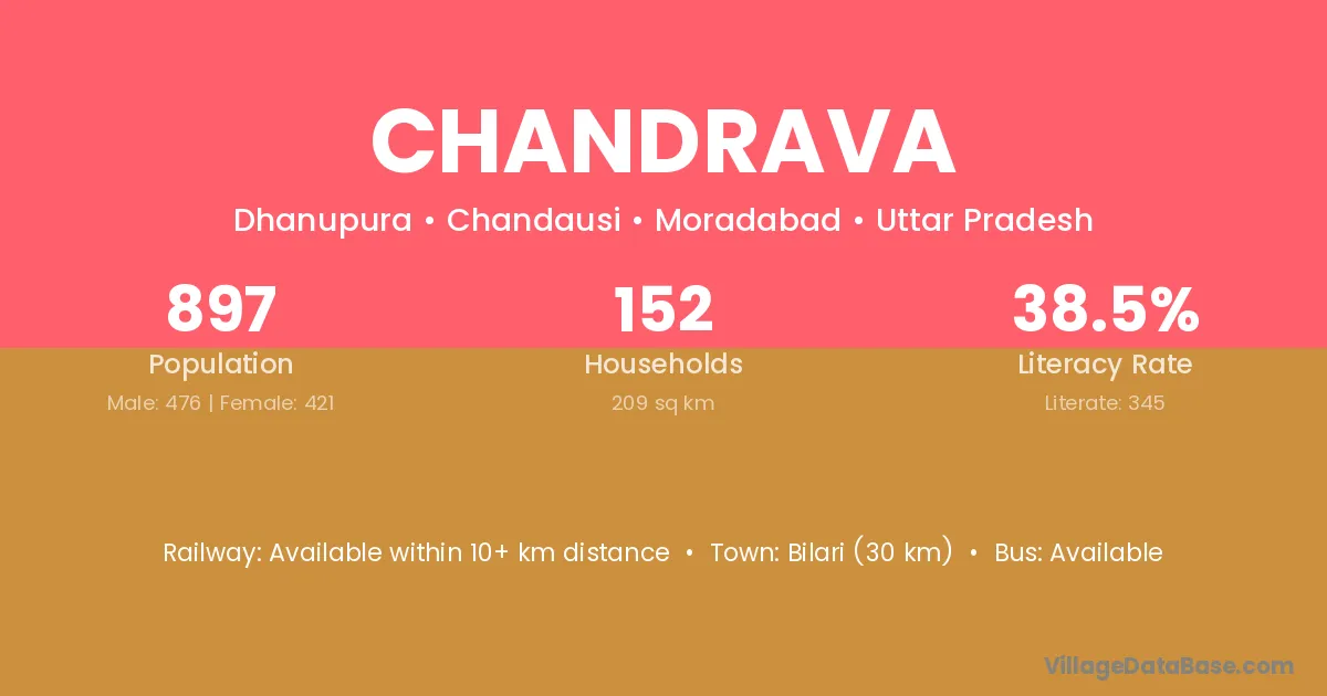 Chandrava village has a total population of 897 people, of which 476 are males and 421 are females.