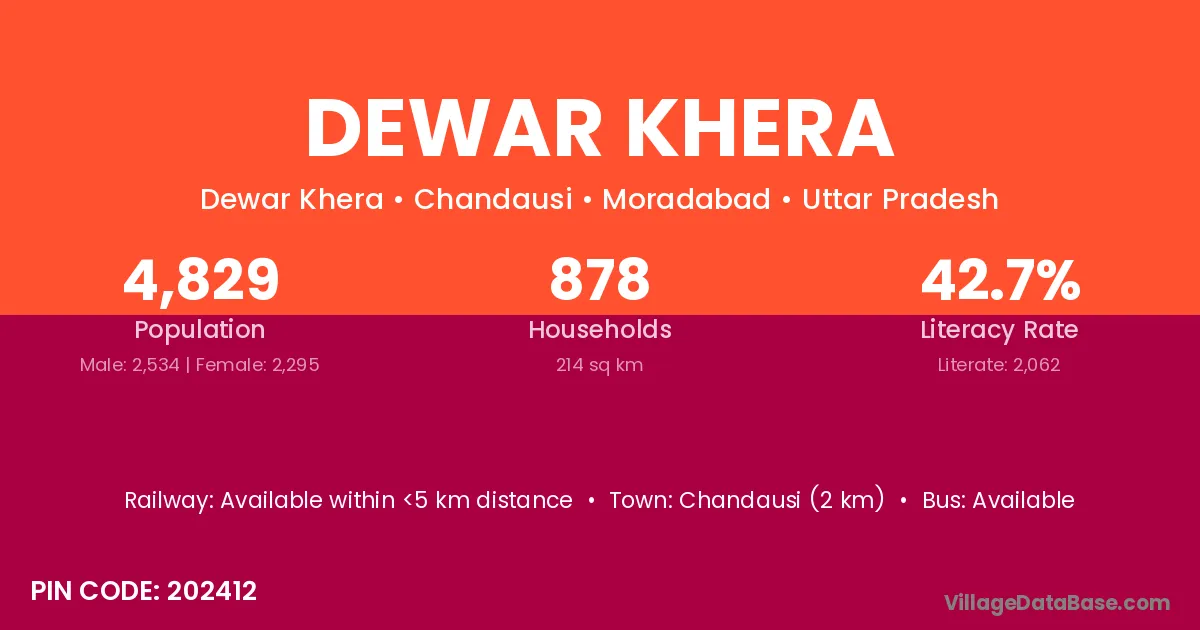 Chandausi (2 km) is the nearest town to Dewar Khera village for major economic activities and is located approximately 2 km away.