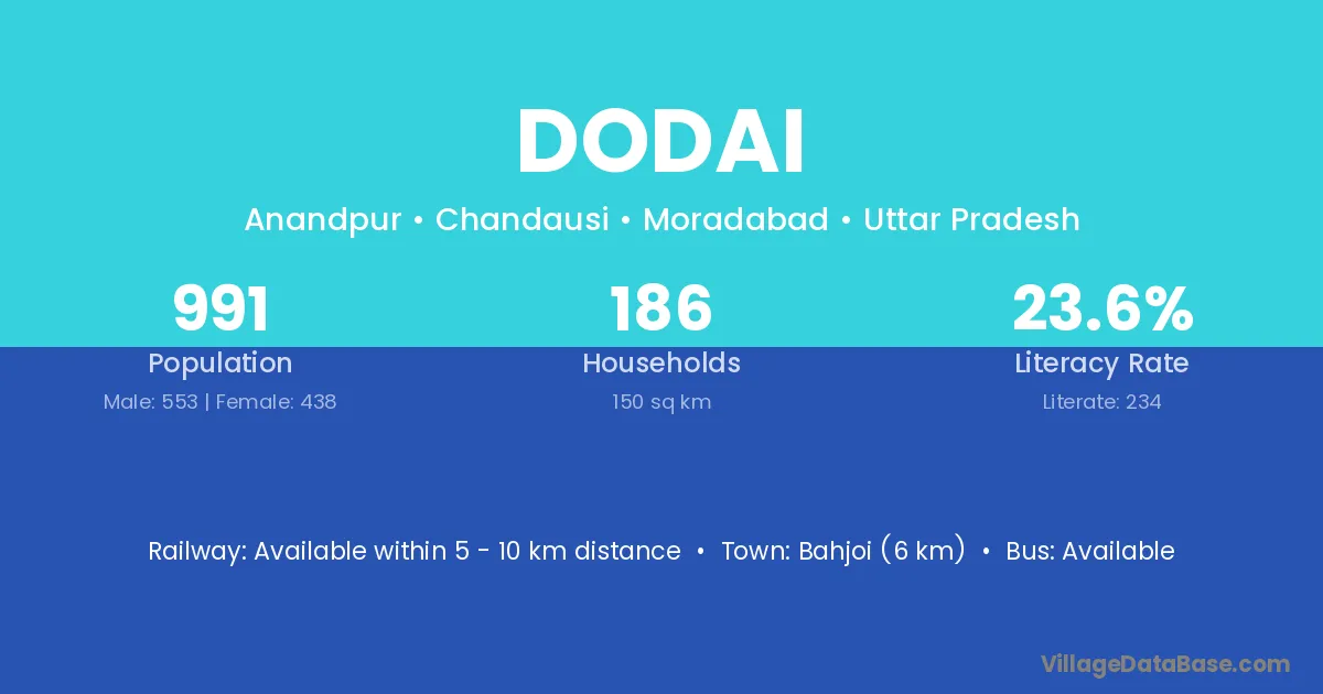 Bahjoi (6 km) is the nearest town to Dodai village for major economic activities and is located approximately 6 km away.