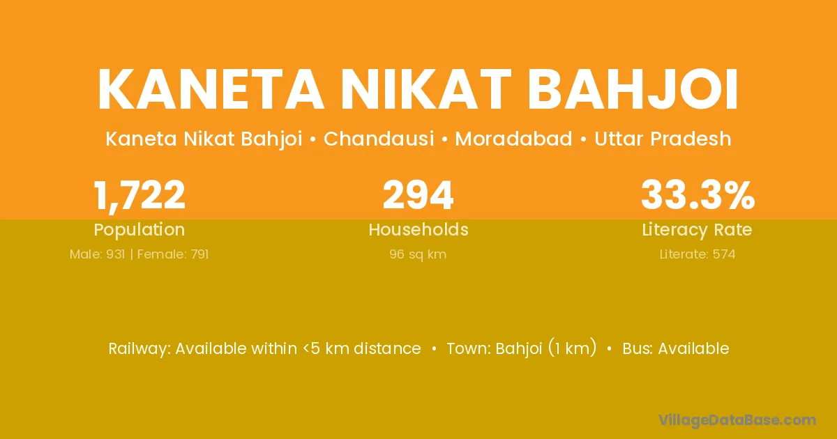 Bahjoi (1 km) is the nearest town to Kaneta Nikat Bahjoi village for major economic activities and is located approximately 1 km away.