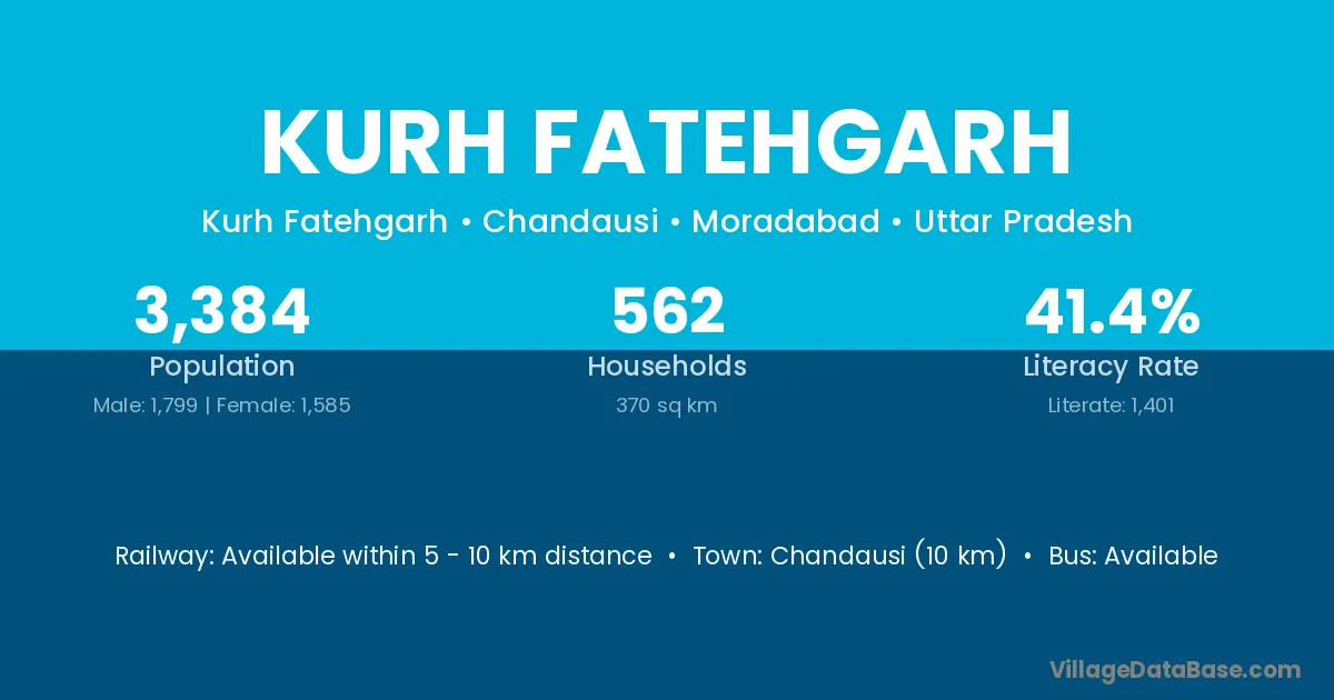 Chandausi (10 km) is the nearest town to Kurh Fatehgarh village for major economic activities and is located approximately 10 km away.