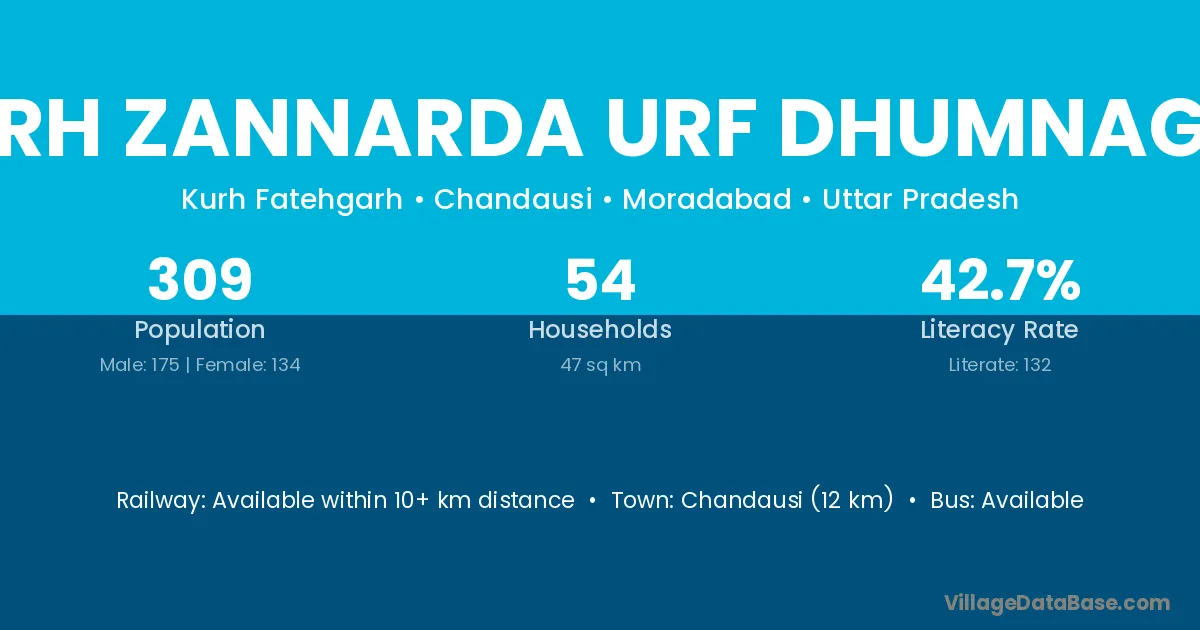 Chandausi (12 km) is the nearest town to Kurh Zannarda Urf Dhumnagar village for major economic activities and is located approximately 12 km away.