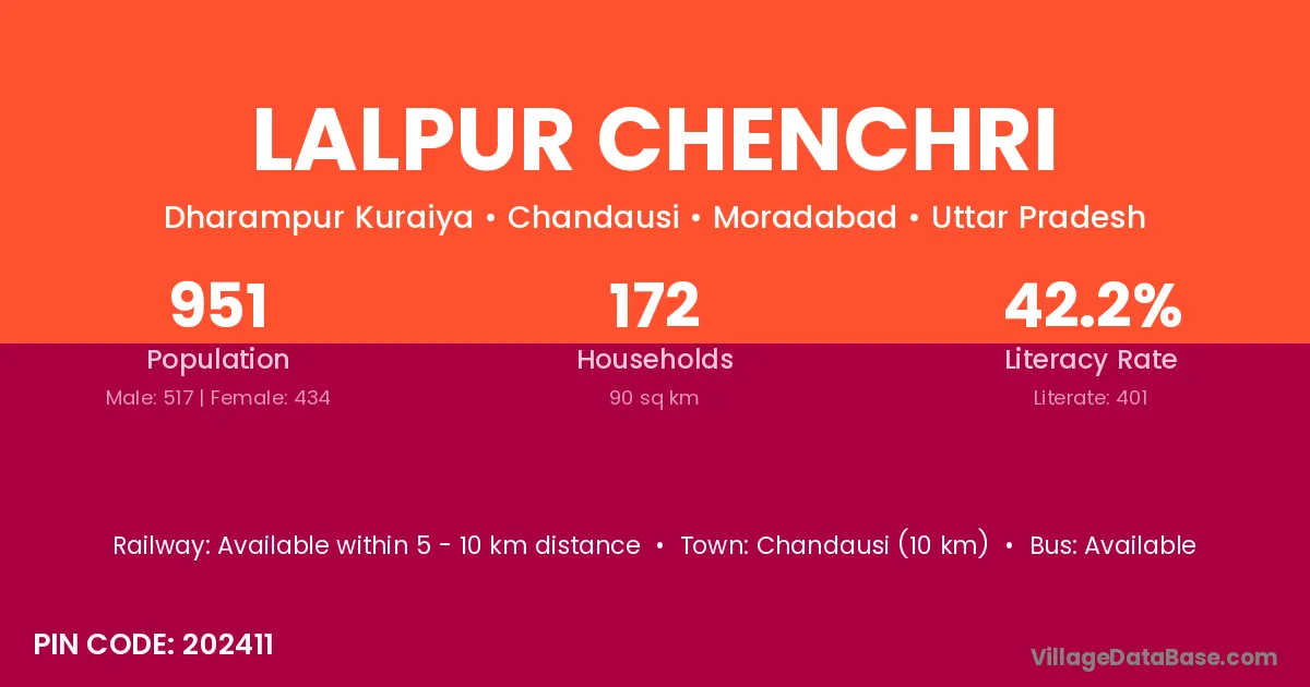 Chandausi (10 km) is the nearest town to Lalpur Chenchri village for major economic activities and is located approximately 10 km away.
