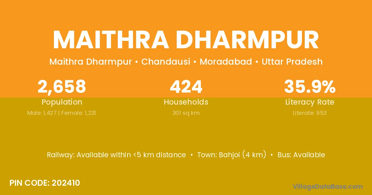 Bahjoi (4 km) is the nearest town to Maithra Dharmpur village for major economic activities and is located approximately 4 km away.