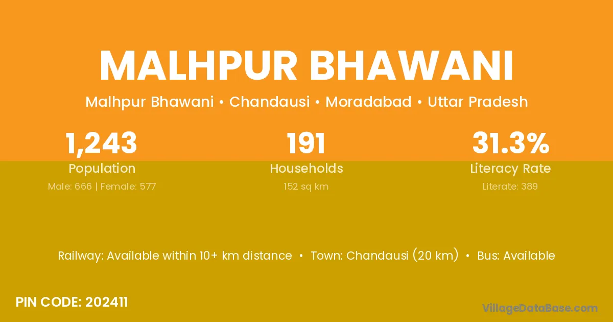 Chandausi (20 km) is the nearest town to Malhpur Bhawani village for major economic activities and is located approximately 20 km away.