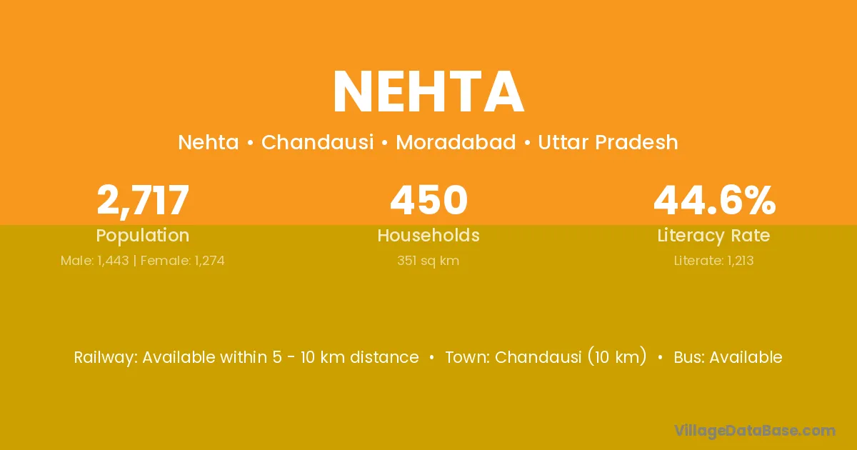 Chandausi (10 km) is the nearest town to Nehta village for major economic activities and is located approximately 10 km away.