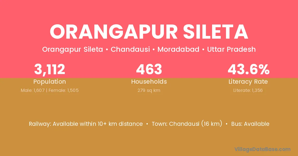 Chandausi (16 km) is the nearest town to Orangapur Sileta village for major economic activities and is located approximately 16 km away.
