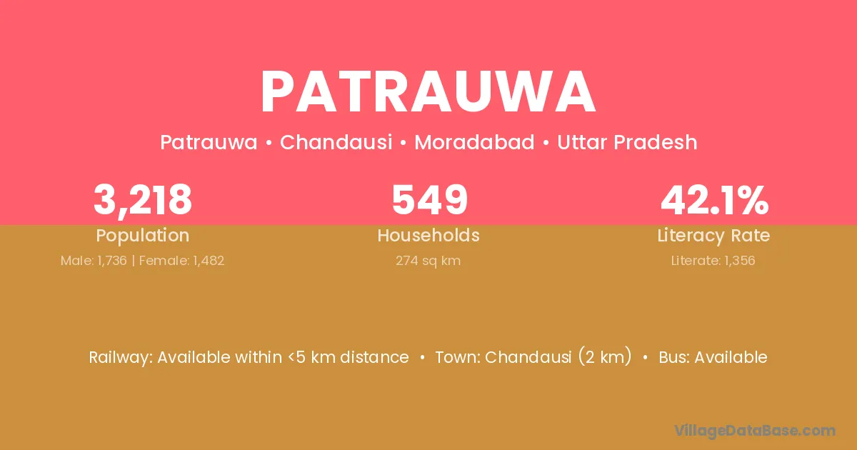 Chandausi (2 km) is the nearest town to Patrauwa village for major economic activities and is located approximately 2 km away.