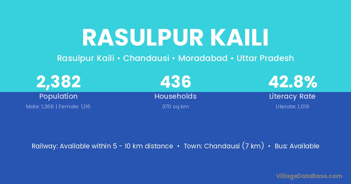 Chandausi (7 km) is the nearest town to Rasulpur Kaili village for major economic activities and is located approximately 7 km away.