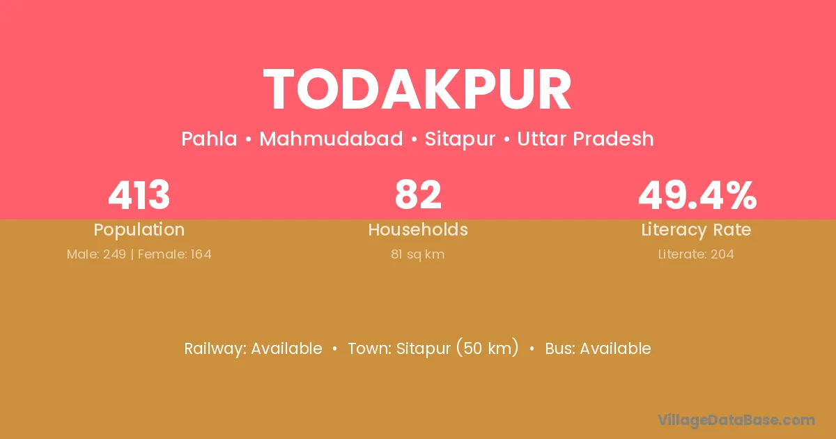 The literacy rate of Todakpur village is 34.99%. Male literacy stands at 45.12% and female literacy at 23.50%.