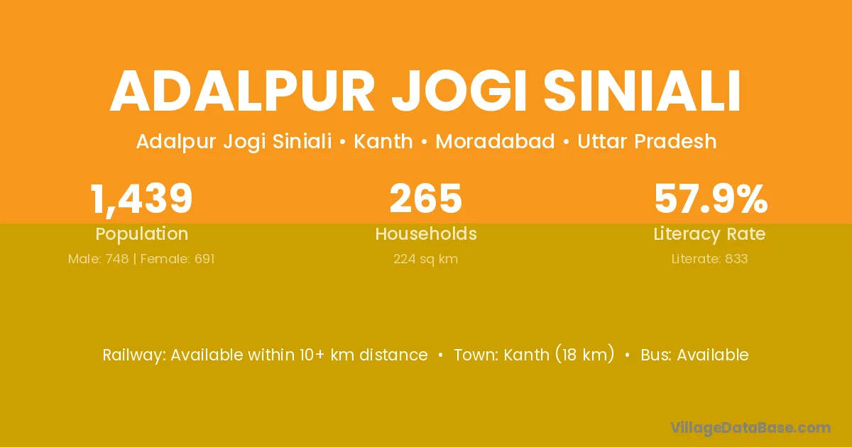 Kanth (18 km) is the nearest town to Adalpur Jogi Siniali village for major economic activities and is located approximately 18 km away.
