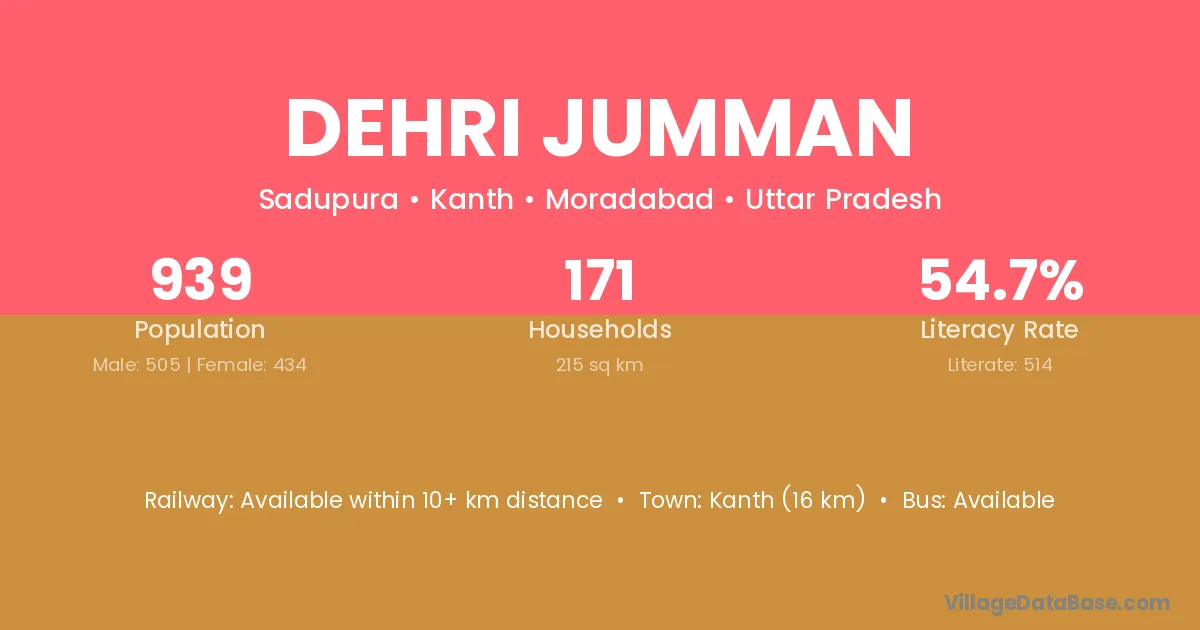 Kanth (16 km) is the nearest town to Dehri Jumman village for major economic activities and is located approximately 16 km away.