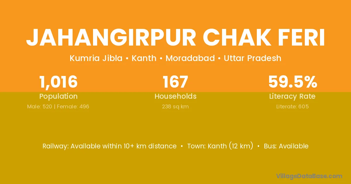Kanth (12 km) is the nearest town to Jahangirpur Chak Feri village for major economic activities and is located approximately 12 km away.