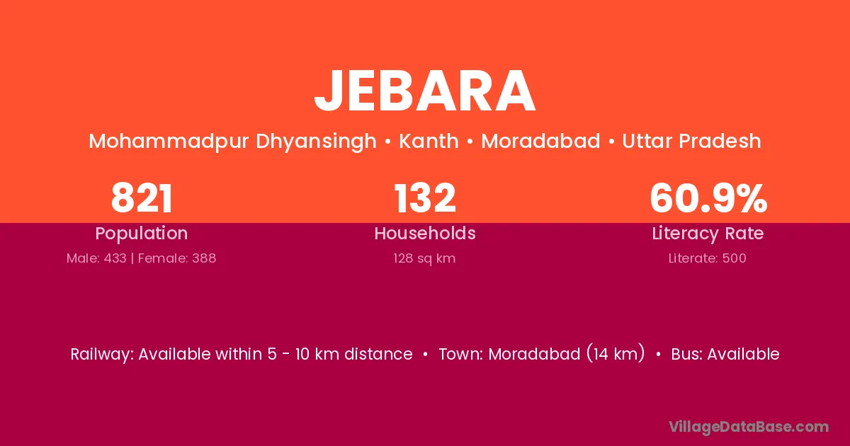Moradabad (14 km) is the nearest town to Jebara village for major economic activities and is located approximately 14 km away.