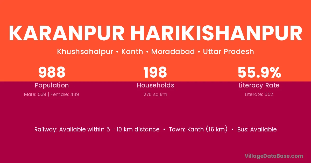 Kanth (16 km) is the nearest town to Karanpur Harikishanpur village for major economic activities and is located approximately 16 km away.