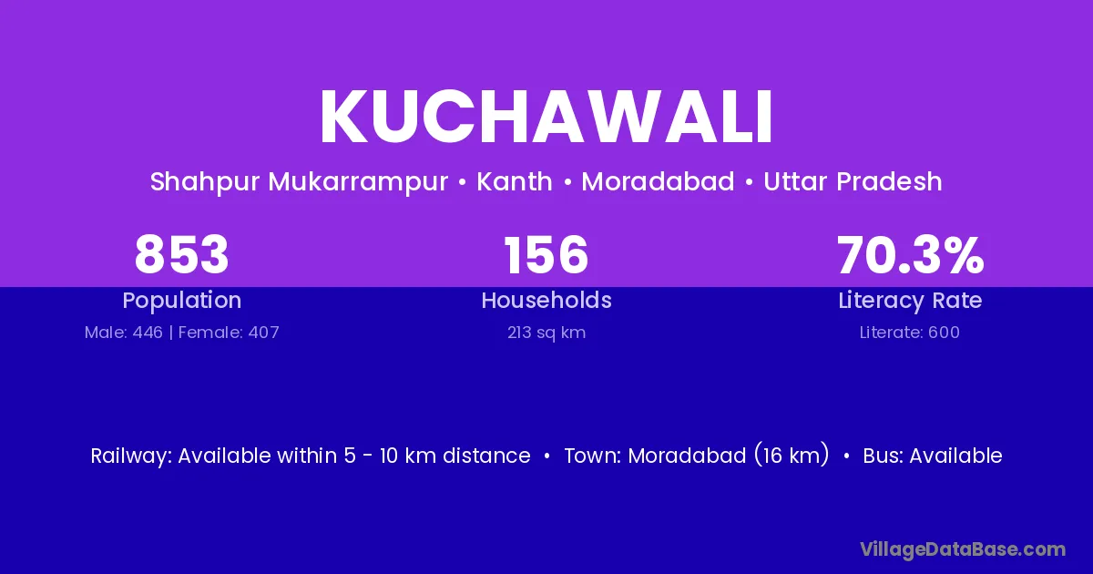 Moradabad (16 km) is the nearest town to Kuchawali village for major economic activities and is located approximately 16 km away.