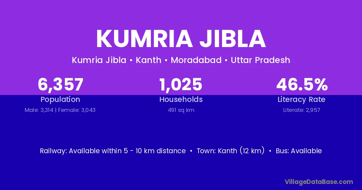 Kanth (12 km) is the nearest town to Kumria Jibla village for major economic activities and is located approximately 12 km away.
