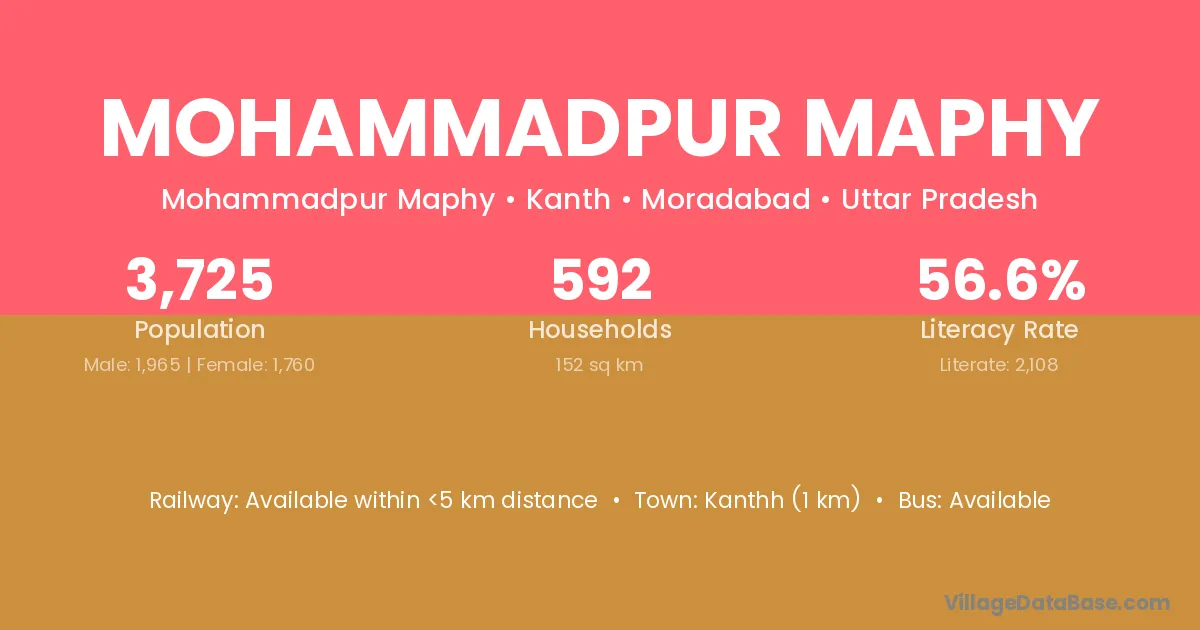 Kanthh (1 km) is the nearest town to Mohammadpur Maphy village for major economic activities and is located approximately 1 km away.