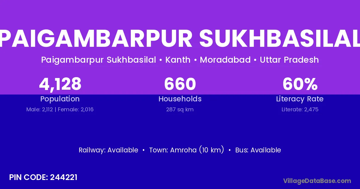 Amroha (10 km) is the nearest town to Paigambarpur Sukhbasilal village for major economic activities and is located approximately 10 km away.