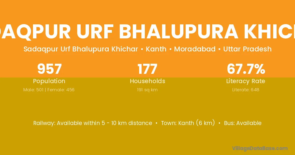 Sadaqpur Urf Bhalupura Khichar village has a total population of 957 people, of which 501 are males and 456 are females.