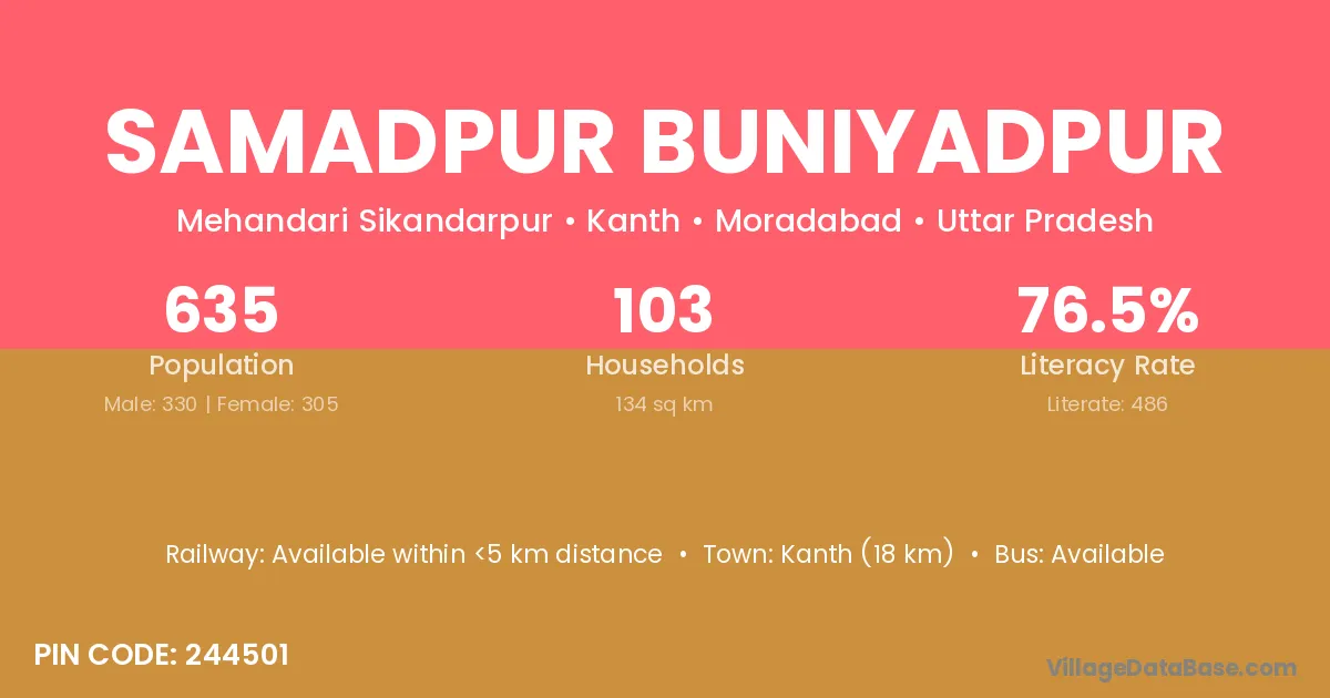 Kanth (18 km) is the nearest town to Samadpur Buniyadpur village for major economic activities and is located approximately 18 km away.