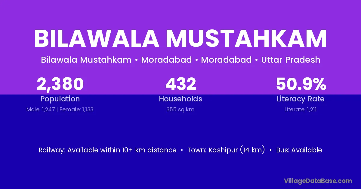 Kashipur (14 km) is the nearest town to Bilawala Mustahkam village for major economic activities and is located approximately 14 km away.