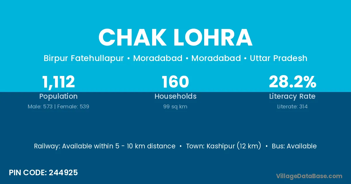 Chak Lohra village has a total population of 1,112 people, of which 573 are males and 539 are females.
