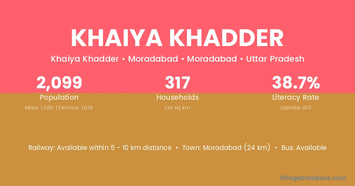 Moradabad (24 km) is the nearest town to Khaiya Khadder village for major economic activities and is located approximately 24 km away.
