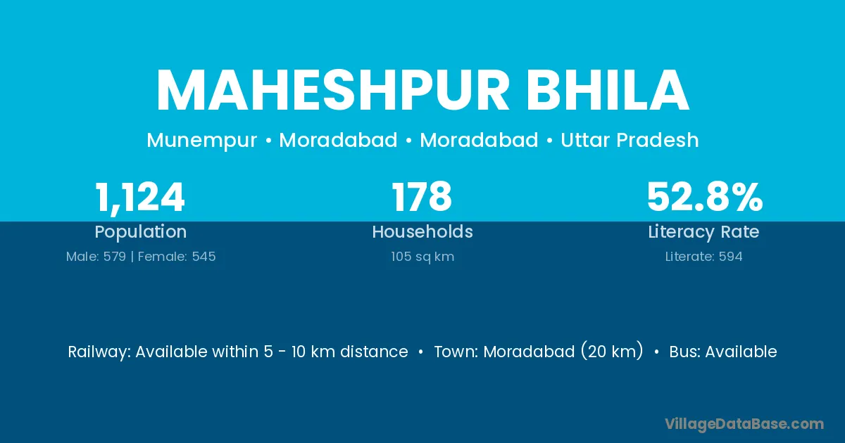 Moradabad (20 km) is the nearest town to Maheshpur Bhila village for major economic activities and is located approximately 20 km away.