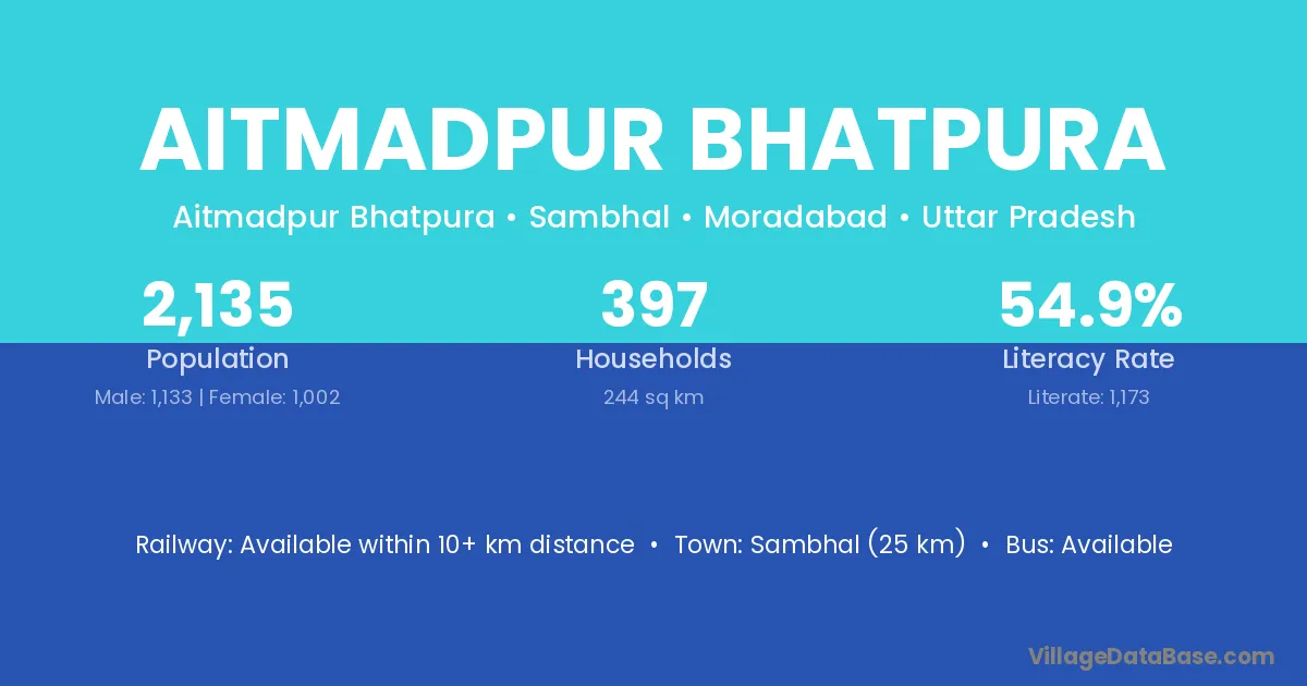 Sambhal (25 km) is the nearest town to Aitmadpur Bhatpura village for major economic activities and is located approximately 25 km away.