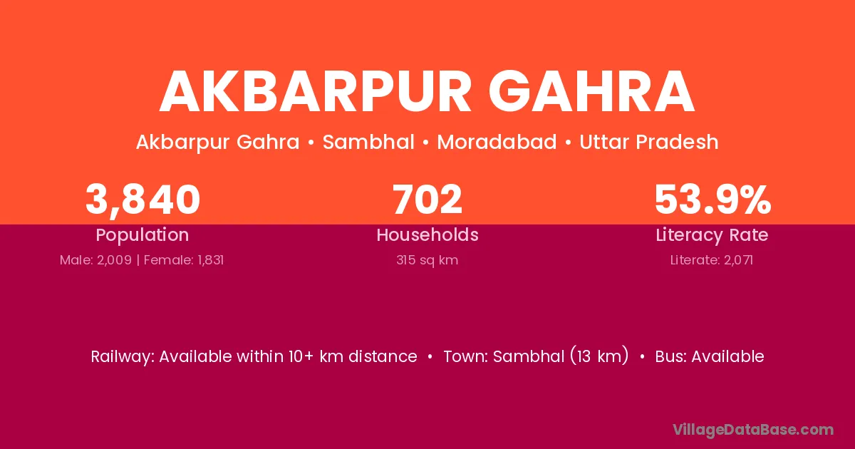 Sambhal (13 km) is the nearest town to Akbarpur Gahra village for major economic activities and is located approximately 13 km away.