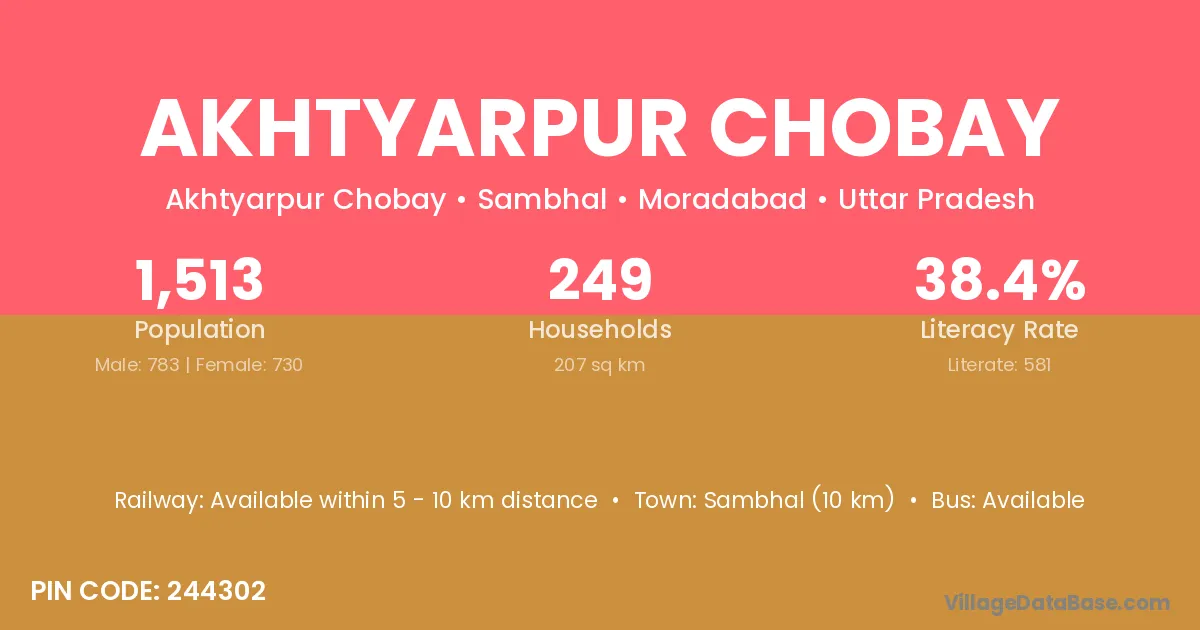 Sambhal (10 km) is the nearest town to Akhtyarpur Chobay village for major economic activities and is located approximately 10 km away.