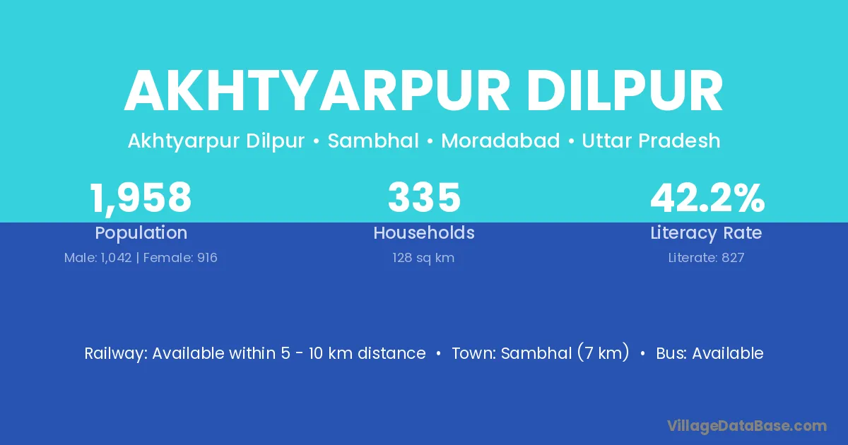 Sambhal (7 km) is the nearest town to Akhtyarpur Dilpur village for major economic activities and is located approximately 7 km away.
