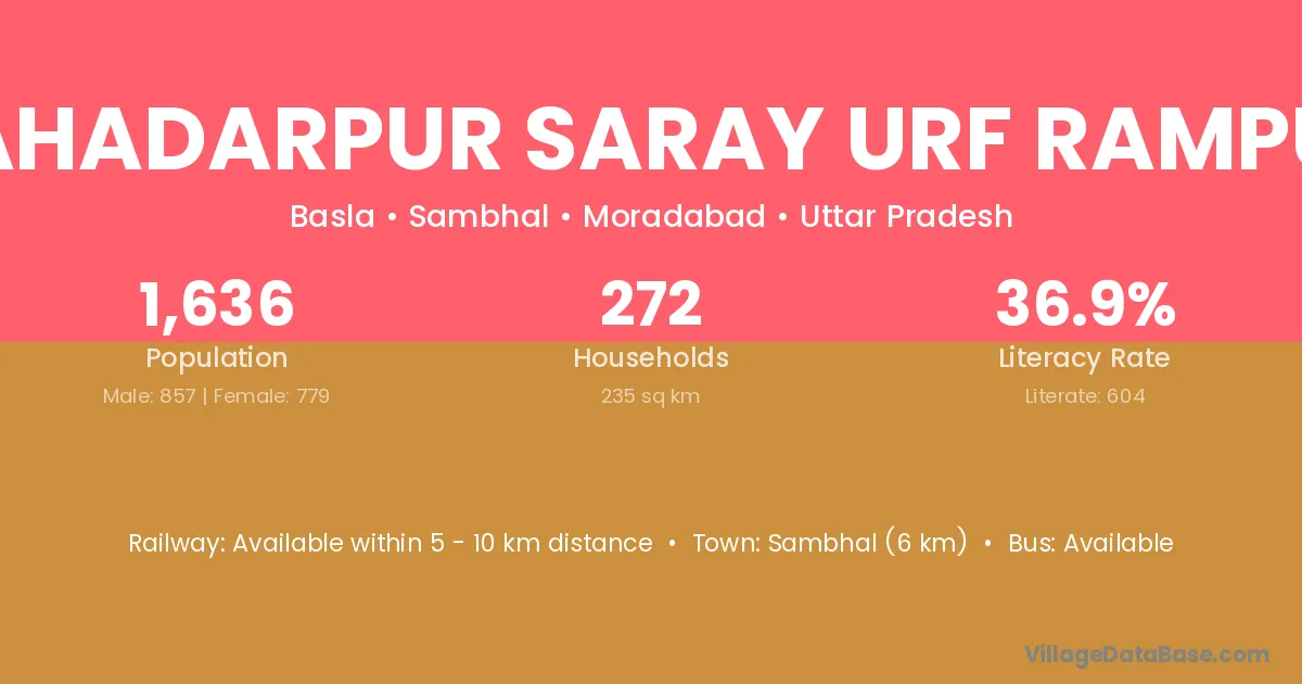 Sambhal (6 km) is the nearest town to Bahadarpur Saray Urf Rampur village for major economic activities and is located approximately 6 km away.