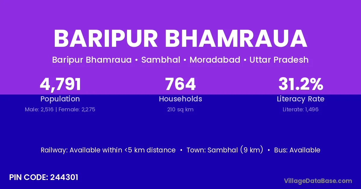 Sambhal (9 km) is the nearest town to Baripur Bhamraua village for major economic activities and is located approximately 9 km away.