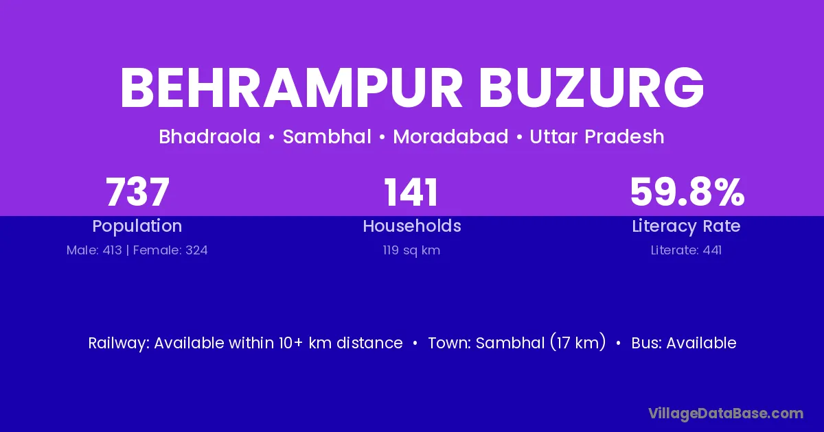 Sambhal (17 km) is the nearest town to Behrampur Buzurg village for major economic activities and is located approximately 17 km away.