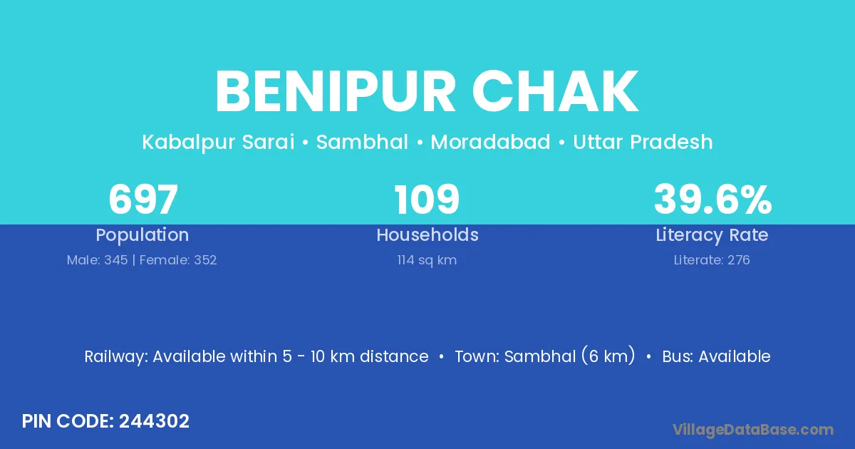 Sambhal (6 km) is the nearest town to Benipur Chak village for major economic activities and is located approximately 6 km away.