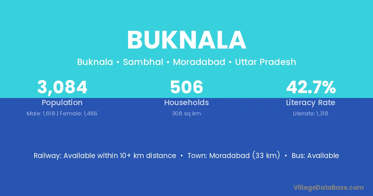 Moradabad (33 km) is the nearest town to Buknala village for major economic activities and is located approximately 33 km away.