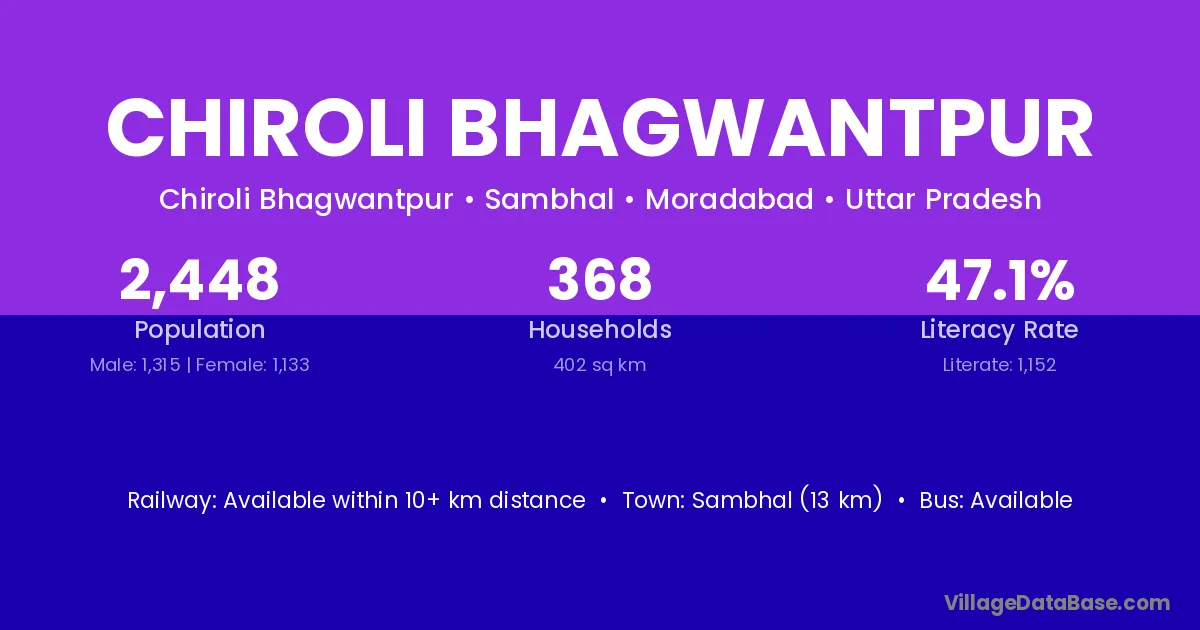 Sambhal (13 km) is the nearest town to Chiroli Bhagwantpur village for major economic activities and is located approximately 13 km away.
