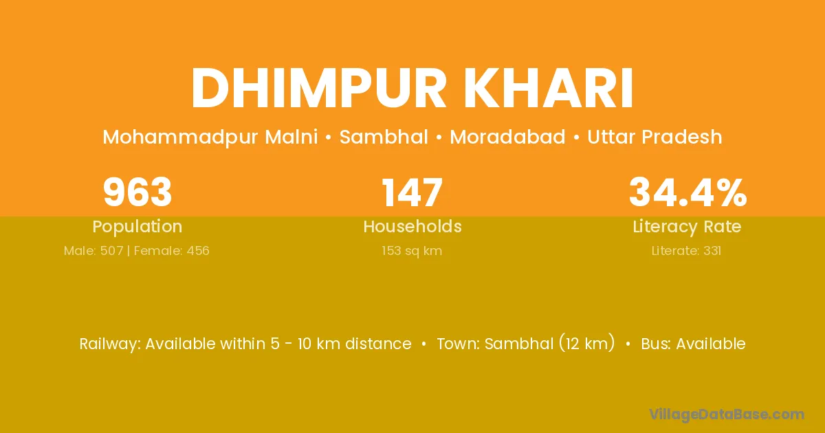 Sambhal (12 km) is the nearest town to Dhimpur Khari village for major economic activities and is located approximately 12 km away.